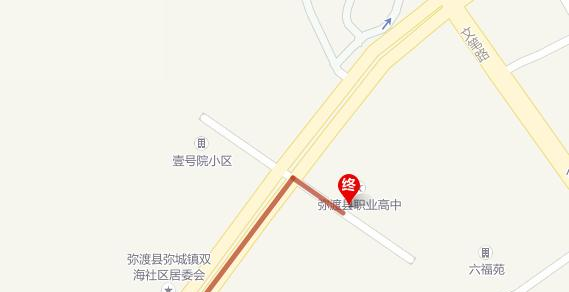 大理汽车客运站东站——从起点出发,在大理市城区道行驶4.8公里,稍向左转走匝道,进入杭瑞高速/G56/AH14/楚大高速——行驶26.9公里,从弥渡/象濞出口离开——行驶5.5公里,调头——行驶5.0公里,左转进入果河公路——行驶15.3公里,左转——行驶1.2公里——弥渡县职业高级中学